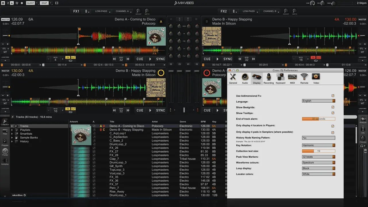 The waveform colors option is located in the Display section of the Cross DJ Preferences. To open the Cross DJ Preferences, click on the cogwheel icon in the upper left hand corner of the software. With the Cross DJ Preferences window open, click on the Display button on the top menu bar. The Waveform Colours dropdown menu is near the bottom of the window.