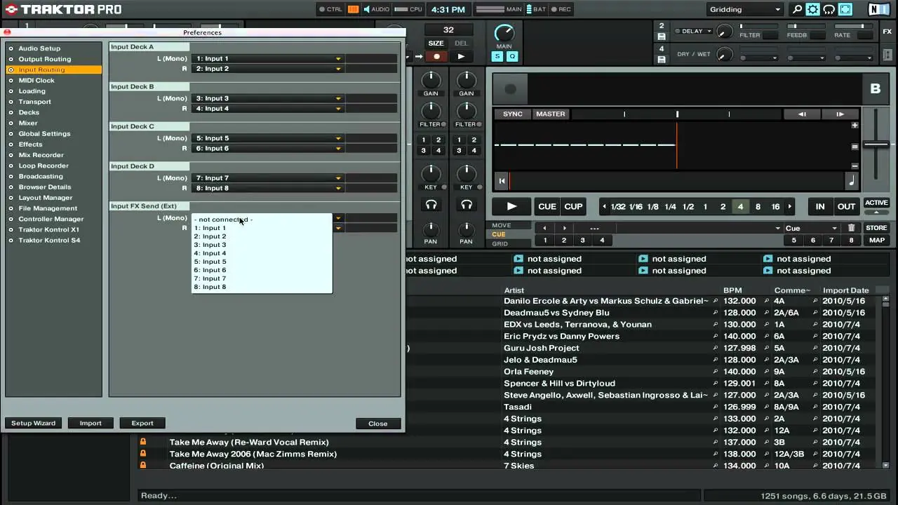 Now that you have your soundcard selected it is time to tell Traktor where you want the audio from each deck to go. The first choice you have in this tab is the Mixing Mode. If you’re using a midi controller with your computer’s built in soundcard, you probably want to choose this option. Internal mixing takes advantage of Traktor’s built in mixer functions. If you’re going to use Traktor with a multi-channel soundcard and an external mixer, choose External. Traktor will automatically change these settings to what it considers optimal. Double check to make sure that all of the settings are correct before moving on to the Input Routing tab