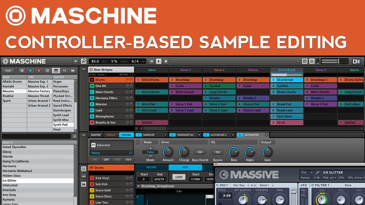 Maschine’s wide array of sample editing features allows you to spend more time creating and less time staring at render bars. Press the Sampling button in the top left corner of the controller to enter sample editing mode. Alternatively, you can press the sample waveform icon underneath the piano roll icon next to the arranger. Once in sample editing mode, you can make changes to the sample in the selected sound slot. Watch this video video tutorial to learn how to use Maschine basic sample editing and more advanced audio editing features.