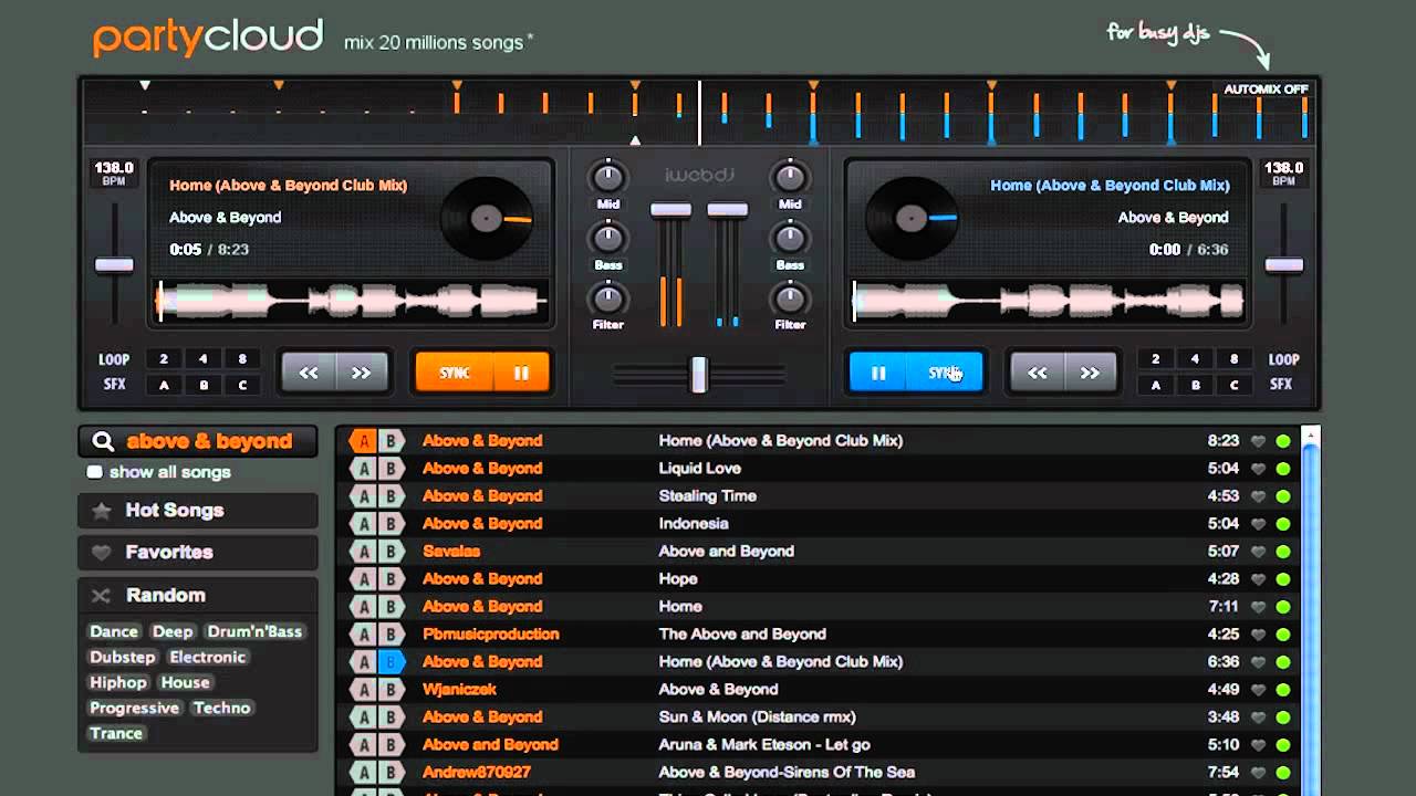 Partycloud.FM is a full DJ mixer with 2 decks and FX that runs in your web browser. With Soundcloud as the track collection, you have access to mix just about any song that you might want. You’ll be surprised by how well you can mix with the sync function, 2 band EQ, and single-knob filters.